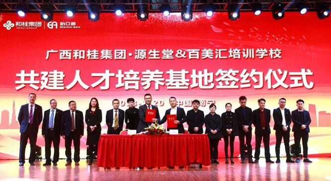 1月20日,源生堂與百美匯培訓(xùn)學(xué)校共建人才培訓(xùn)基地簽約儀式,在廣西和桂集團(tuán)2018年年會現(xiàn)場隆重舉行。此次簽約標(biāo)志著首個中國天然養(yǎng)發(fā)人才培養(yǎng)基地的成立。廣西和桂集團(tuán)總裁黃偉文先生、源生堂執(zhí)行總經(jīng)理舒志華女士、百美匯培訓(xùn)學(xué)校校長王勇先生等領(lǐng)導(dǎo)出席本次簽約儀式。中央電視臺、廣西電視臺、南國早報、網(wǎng)易網(wǎng)、中國網(wǎng)、中國經(jīng)濟(jì)時報、新浪新聞、百度新聞等媒體,以及源生堂供應(yīng)商、加盟商、員工等近千人,共同見證了首個中國天然養(yǎng)發(fā)人才基地的簽約儀式。