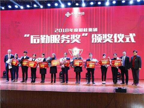 (源生堂工程部季明明(左三)教育部李春燕(左四)榮獲集團(tuán)“后勤服務(wù)獎(jiǎng)”)
